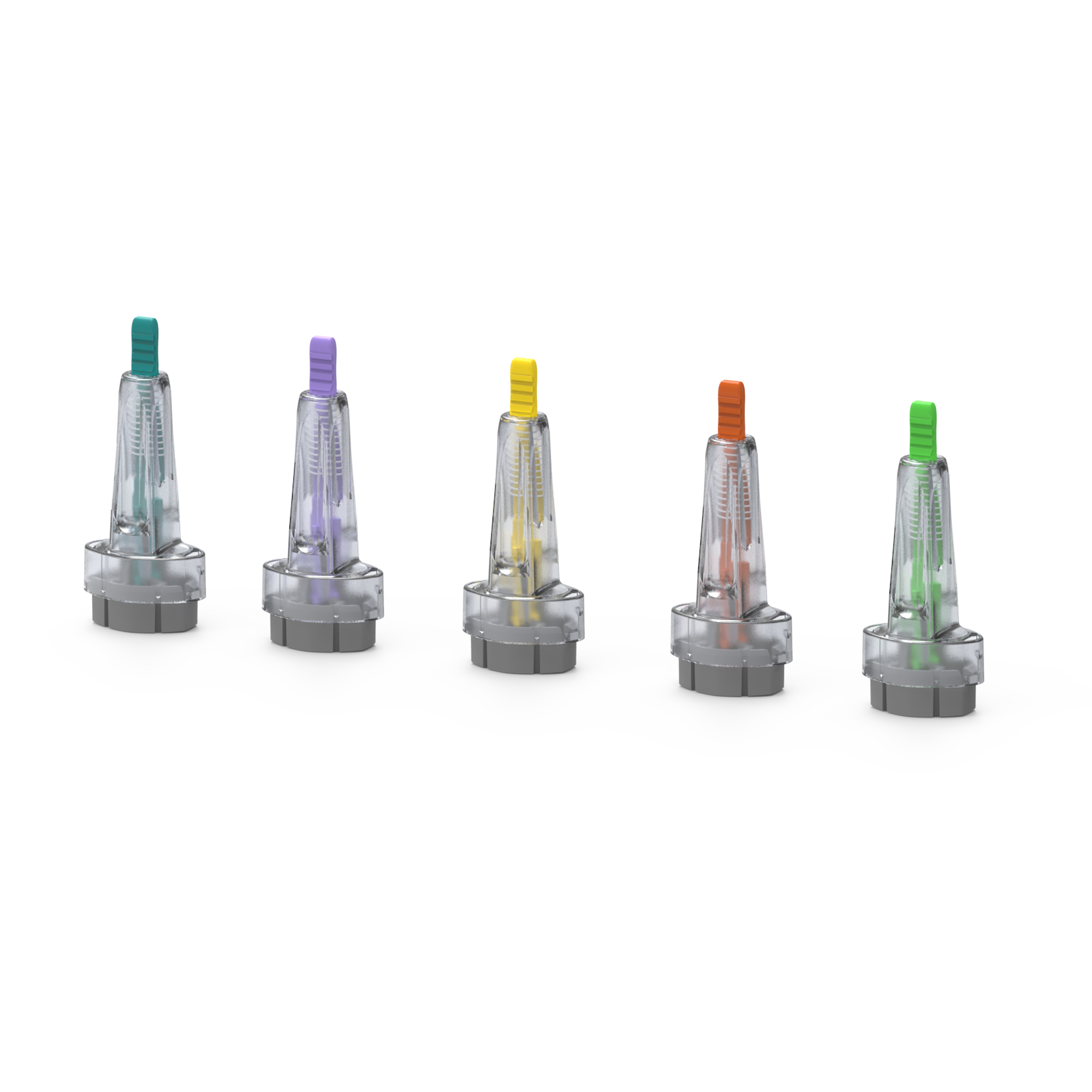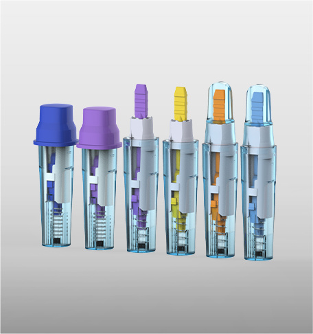 筒形采血笔OneStep型一步装针,无需卸帽。 筒形采血笔OneStep型专配SoftSense型采血针,不通配市面上其他款式采血针。