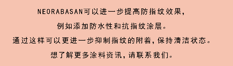 NEORABASAN是一种特殊的软触感涂料,耐水解。由于具有不易显现指纹的特性,与普通涂料相比,即使粘附指纹或手上污垢,其明显程度也会减少。指纹是由于含有皮脂和汗水等含有油分的指尖接触到表面而形成的,而NEORABASAN具有抑制这种附着的效果。