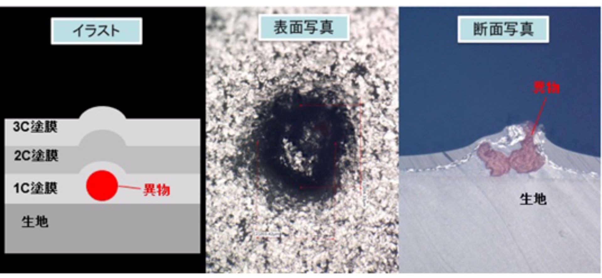 “颗粒”是关于喷涂的咨询中最常见的缺陷之一。通过详细的缺陷验证,可以确定混入异物的工序。从上面的图像可以看出,在某个喷涂工序中混入了异物,导致涂膜出现了突起。此外,分析异物的成分可以推测异物的来源。这使得我们能够迅速处理喷涂工序中的问题。