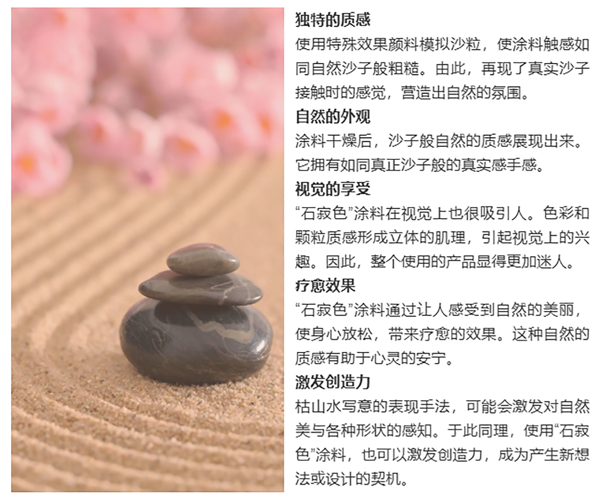 “石寂色”是一种能够表达融合和风格和自然美的涂料。该涂料的灵感来源于传统庭园“枯山水”,重视与自然的和谐。以下将详细介绍“石寂色”的特点及其效果。