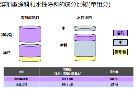 以下两幅图可以很好地帮助您理解水性涂料与溶剂型涂料的成分组分。