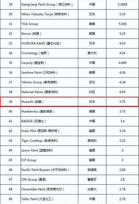 本次上榜的82家公司年销售额均超过1亿美元,其中,中国有8家涂料企业杀入重围,武藏涂料作为在中国拥有4家分公司的跨国企业,能够突破40名大关,位列第39位,这得益于全体武藏人兢兢业业服务客户以及提供品质稳定的产品所累积的口碑。自1958年创业迄今为止,武藏涂料集团的生产·营销网络已遍布全球10个国家14个地区。自1999年进入中国以来,先后在中山、苏州、昆山、天津、重庆成立分公司,构建了从南到北的全境对应体制。作为一家致力于引领涂料行业发展的集团公司,我们利用独有的体制增强团体的凝聚力,秉承以独创的领先技术,运用智慧开发并生产出质量稳定而优良的工业涂料为经营理念,供应全球市场,持续不断向全球汽车内饰、手机、笔记本、家电等领域提供优质、稳定的喷涂解决方案。跻身全球涂料企业的武藏涂料集团将继续秉承根据独创性的思维开发、生产、销售能够为社会作出贡献的涂料,保证用户、原材料供应商、股东及员工的利益,使得每一名员工在精神生活和物质生活上取得丰硕成果,让员工对自己从事的事业充满自豪感的经营理念,继续致力于提高公司的整体品质,通过提供质量稳定的工业涂料,为提高顾客满意度,持续开展事业活动与质量活动。