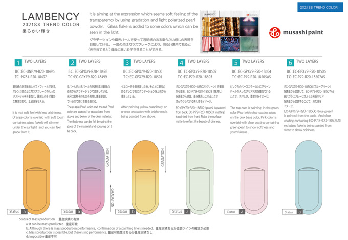 2020年仲秋,武藏涂料中国依据国际流行色委员会(International Commission for Color)所发布的6个品类共计56款趋势色,以涂料形式将其中3个品类共计22款颜色制作成色板对外发布,以此抛砖引玉供各相关行业的设计大咖碰撞灵感,启迪思维。