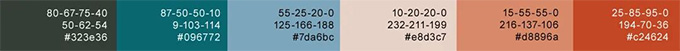 色彩分析:深蓝绿色配暗橙色,整体明度较低,展现出萧索的深秋景象。橙色属于暖色,使色彩意象不过于寒冷。