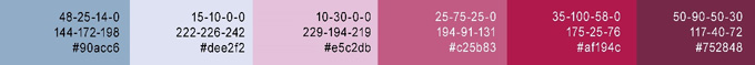 色彩分析:蓝灰色紫红色搭配,整体色彩的纯度较低、色调偏冷,正符合霜降后日渐严寒的天气。
