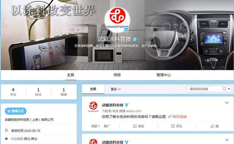 5月21日武藏涂料官方微博在新浪微博正式上线,欢迎关注,期待与您在微博上有更多的互动。