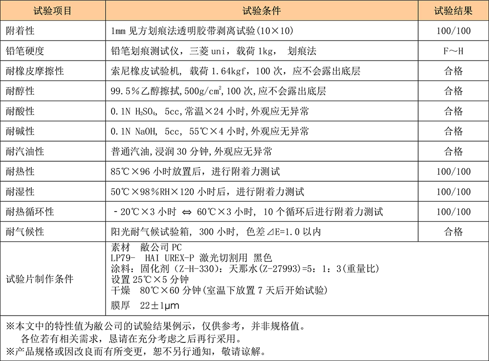 相对合成树脂用溶剂型涂料无法满足的耐醇性及耐化学品性等,本品可发挥优异的涂膜性能,无论是在单工序涂膜中还是双工序、三工序规格以及与Primer、UV 涂料的组合搭配规格等方面均可使用,可适用多种规格。此外,因本品对各种塑料素材也具备稳定的附着性,可用于汽车车载零件、家电产品、光学仪器等的喷涂,适用范围广泛。