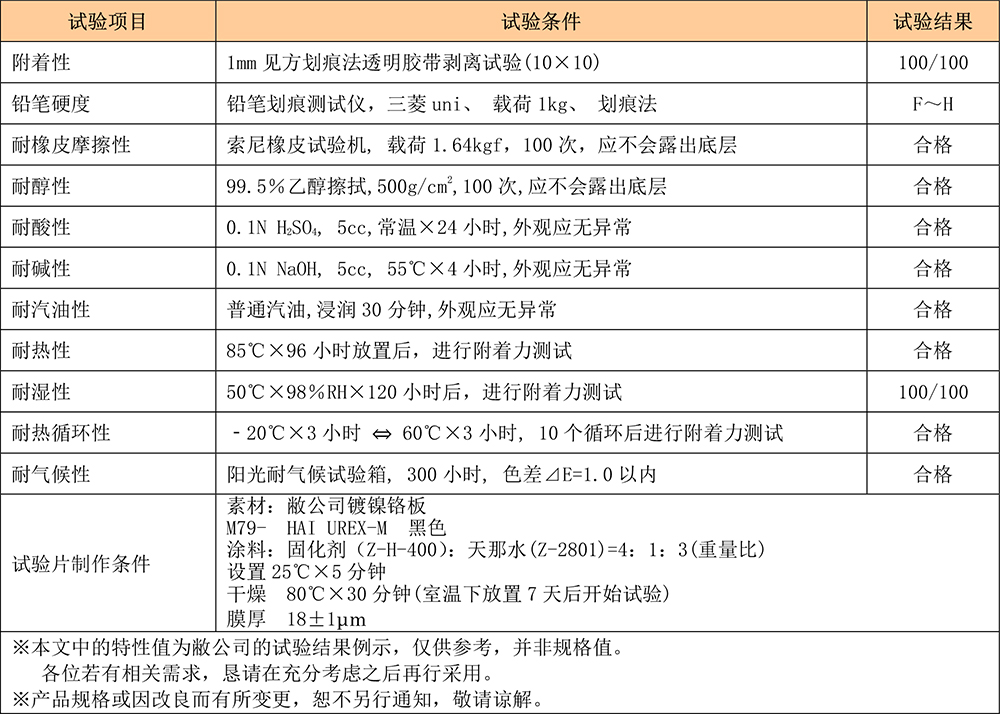 HAI UREX-M(M79-系列)为双组分丙烯酸聚氨酯涂料,对各种金属电镀、合成树脂电镀、各种轻金属、尿素树脂及酚醛树脂成型品等广范围材质具良好的附着性。此外,本涂料不仅具备优异的耐候性、光泽感及厚重感,还具备卓越的耐化学品性及柔韧性。